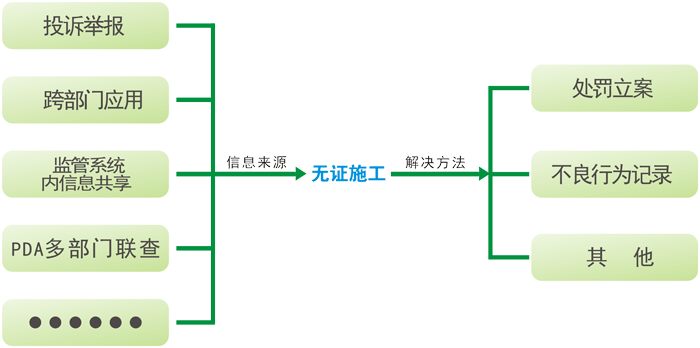 ★ 通過投訴舉報、跨部門應用、監管系統內的信息共享、PDA多部門聯查等方式查出是否有無證施工的現象,如發現針對不同情況提出不同解決方案。
