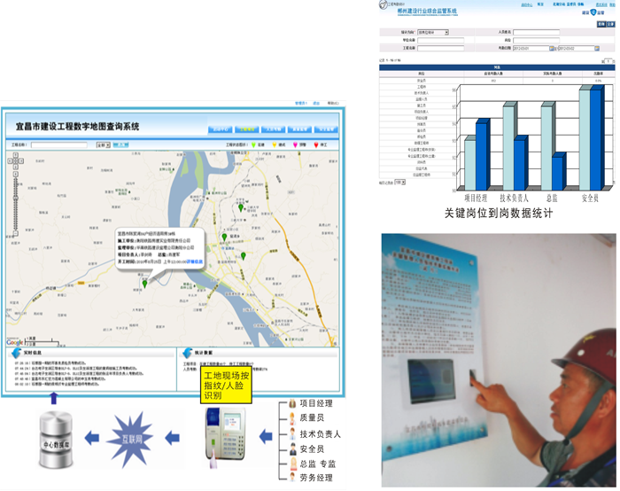 ★ 每個工地現場安裝指紋儀或人臉識別系統,關鍵崗位人員考勤數據實時上傳監管部門,系統依據考勤規則,在電子地圖上顯示不同的顏色。