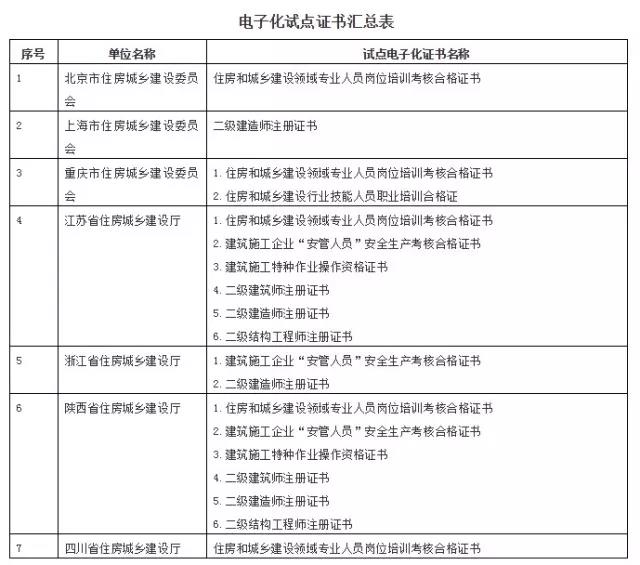 2018年5月30日住建部官網發布《關于同意在部分地區開展住房和城鄉建設領域從業人員有關證書電子化試點的復函》,將全面開展二級建造師證書、二級建筑師、“三類人員”證書(A/B/C證)、住房和城鄉建設領域專業人員崗位培訓考核合格證書等電子化試點工作,將在7省市(北京市、上海市、重慶市、江蘇省、浙江省、陜西省、四川省)開啟。